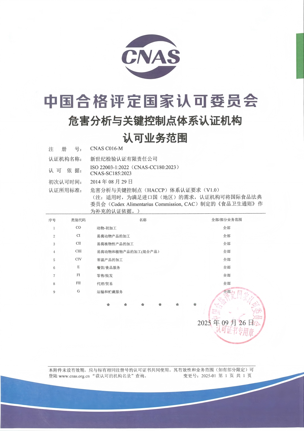 危害分析与关键控制点认证机构认可证书
