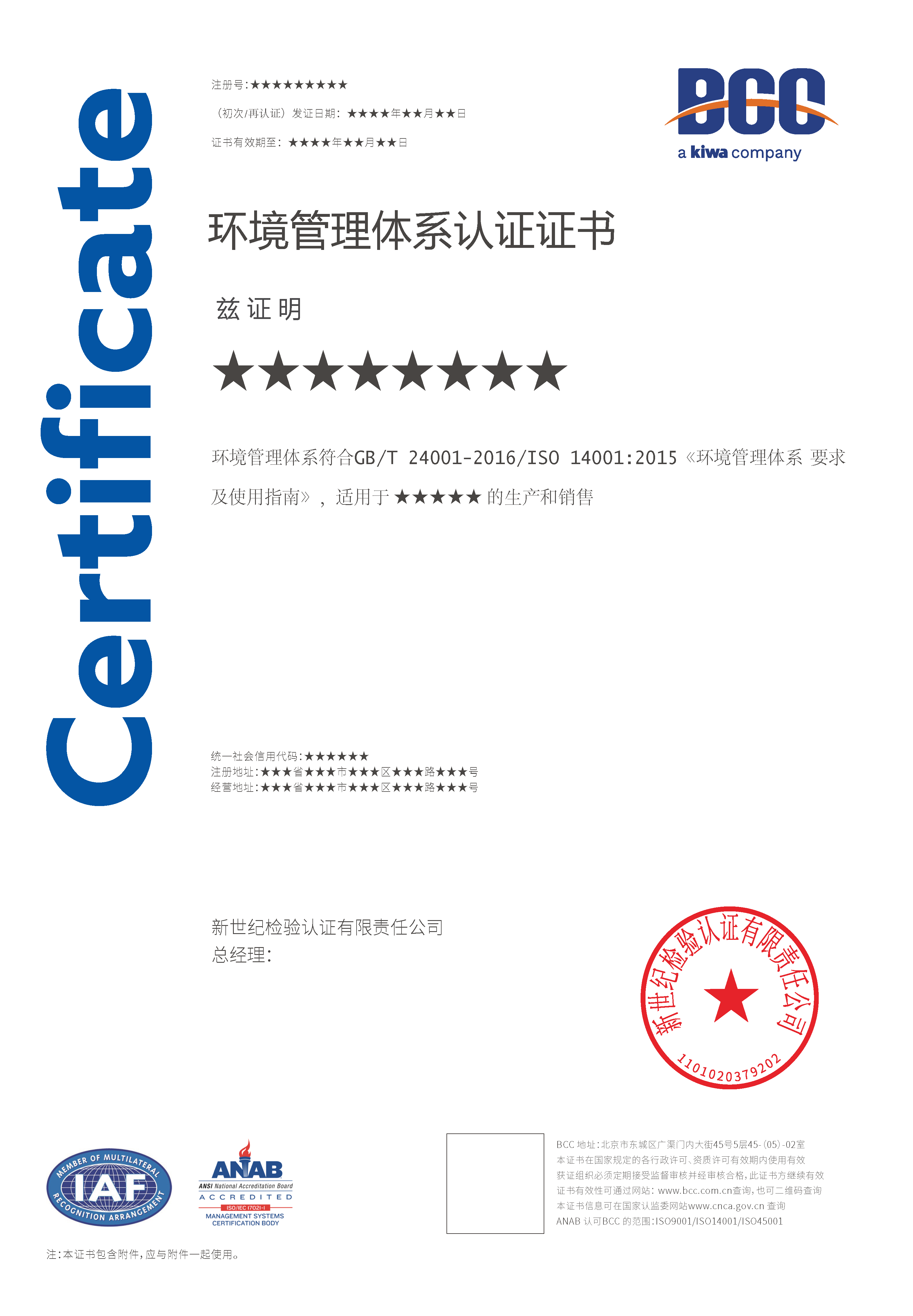 本页涉及的认证服务中均有对应的《认证实施规则》,BCC拥有其最终解释权。任何组织及个人未经BCC许可,不得以任何形式全部或部分使用(法律要求除外)认证相关信息。如需获取相关实施规则请用以下方式联系获取:电话:010-58579316 邮箱:fwjs@kiwa.cn