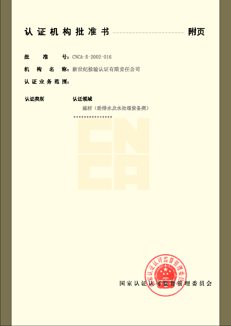 产品认证机构认可证书