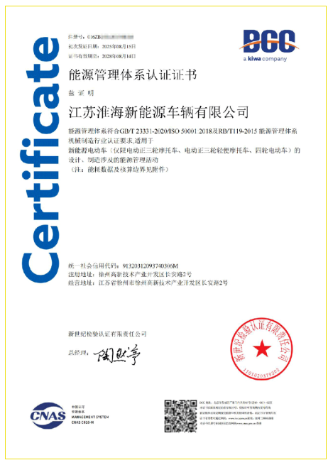 认证不仅是对淮海新能源车辆在能源管理领域卓越表现的高度认可,更是对其在新能源领域持续创新与高质量发展的有力见证。——近日,江苏淮海新能源车辆有限公司(简称:淮海新能源车辆)获新世纪检验认证有限责任公司(Kiwa BCC)颁发的能源管理体系认证证书。